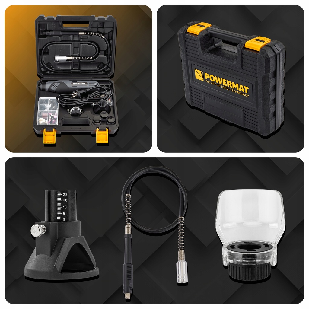 Dostajesz ponad 180 akcesoriów, elastyczny wałek, regulowaną prowadnicę i osłonę głowicy dla bezpieczeństwa. To kompletny zestaw do metalu, szkła, drewna i ceramiki w solidnej walizce.