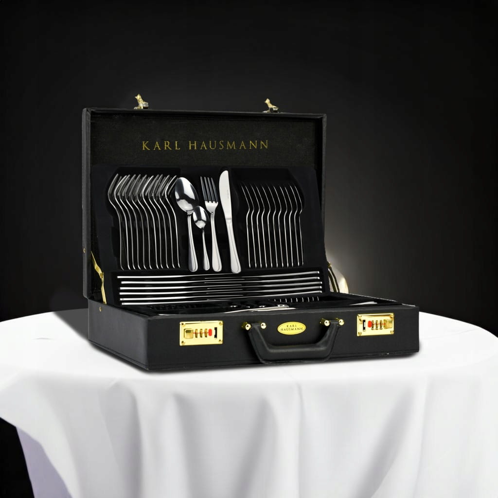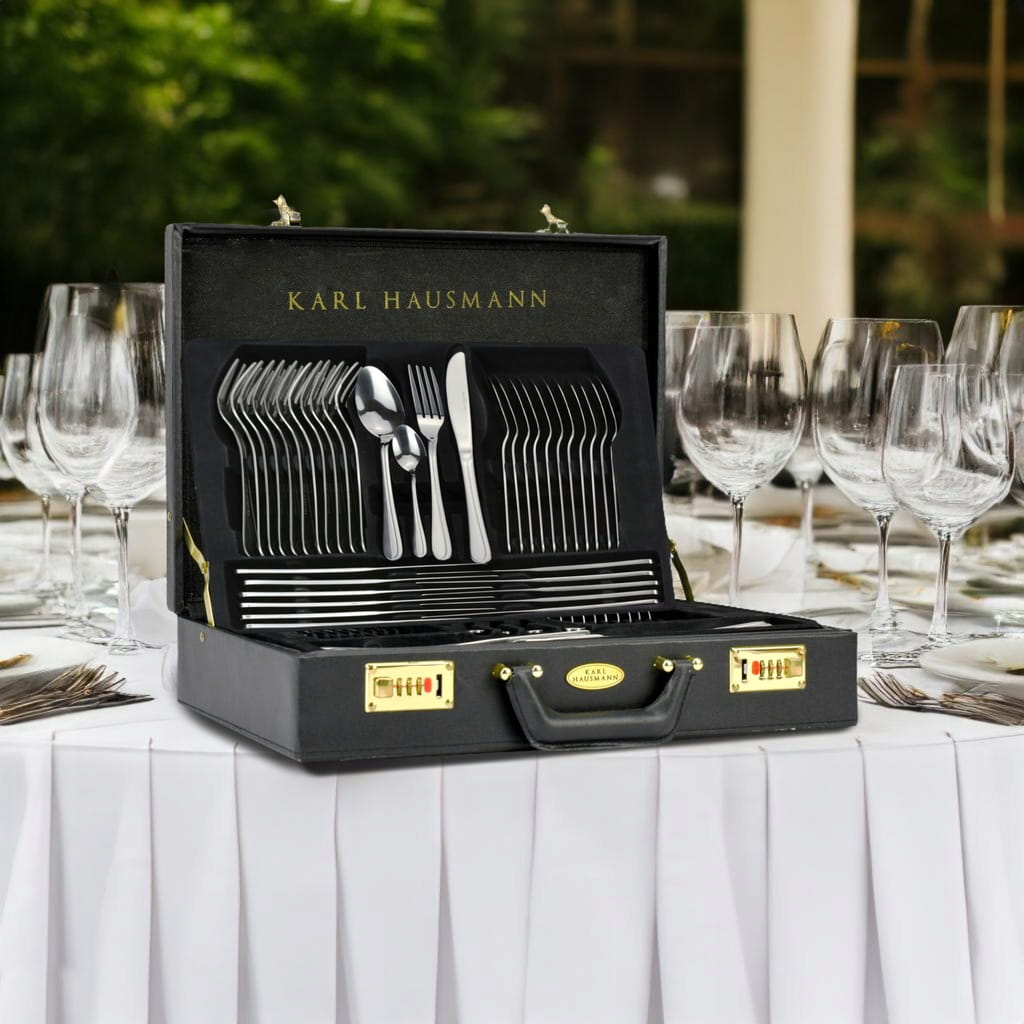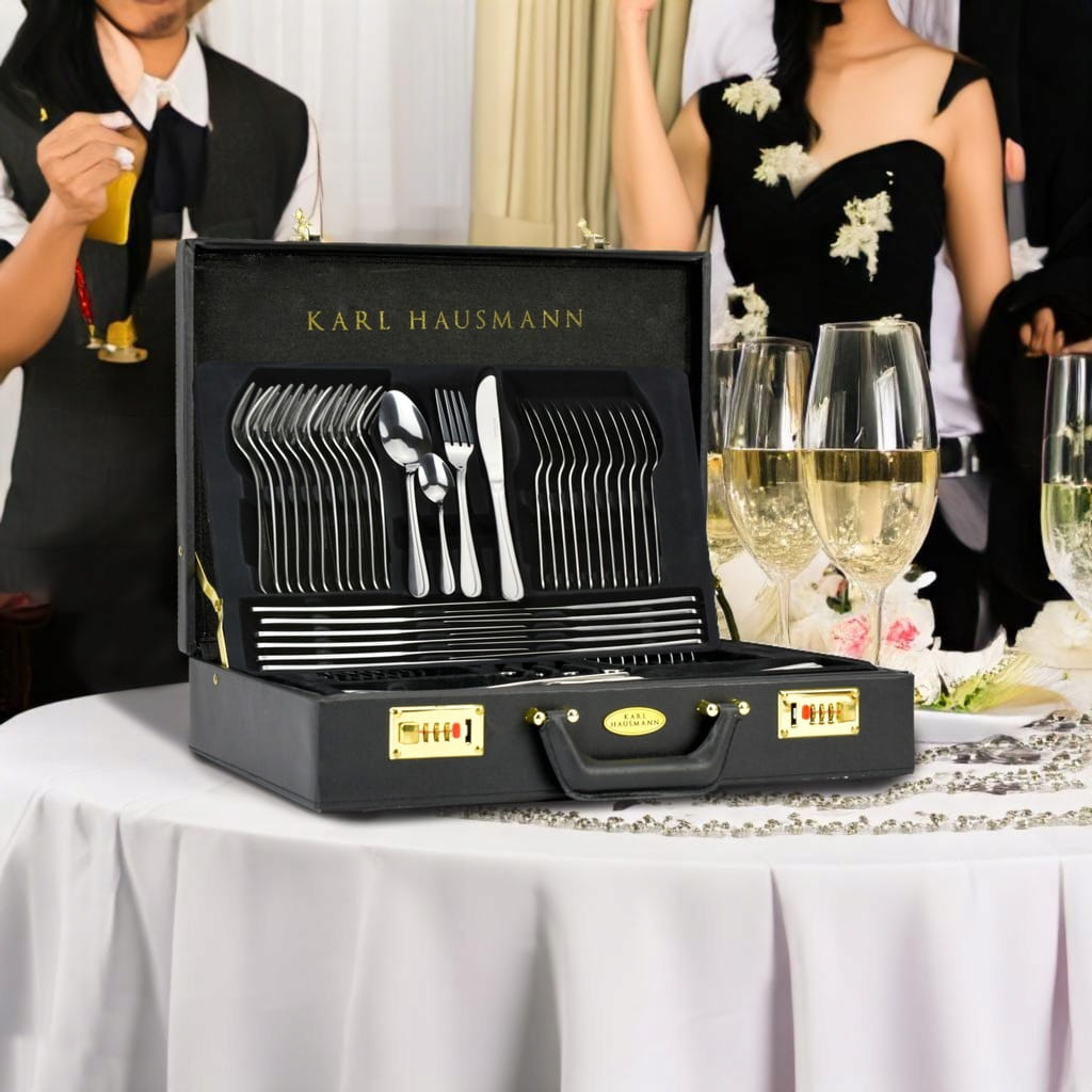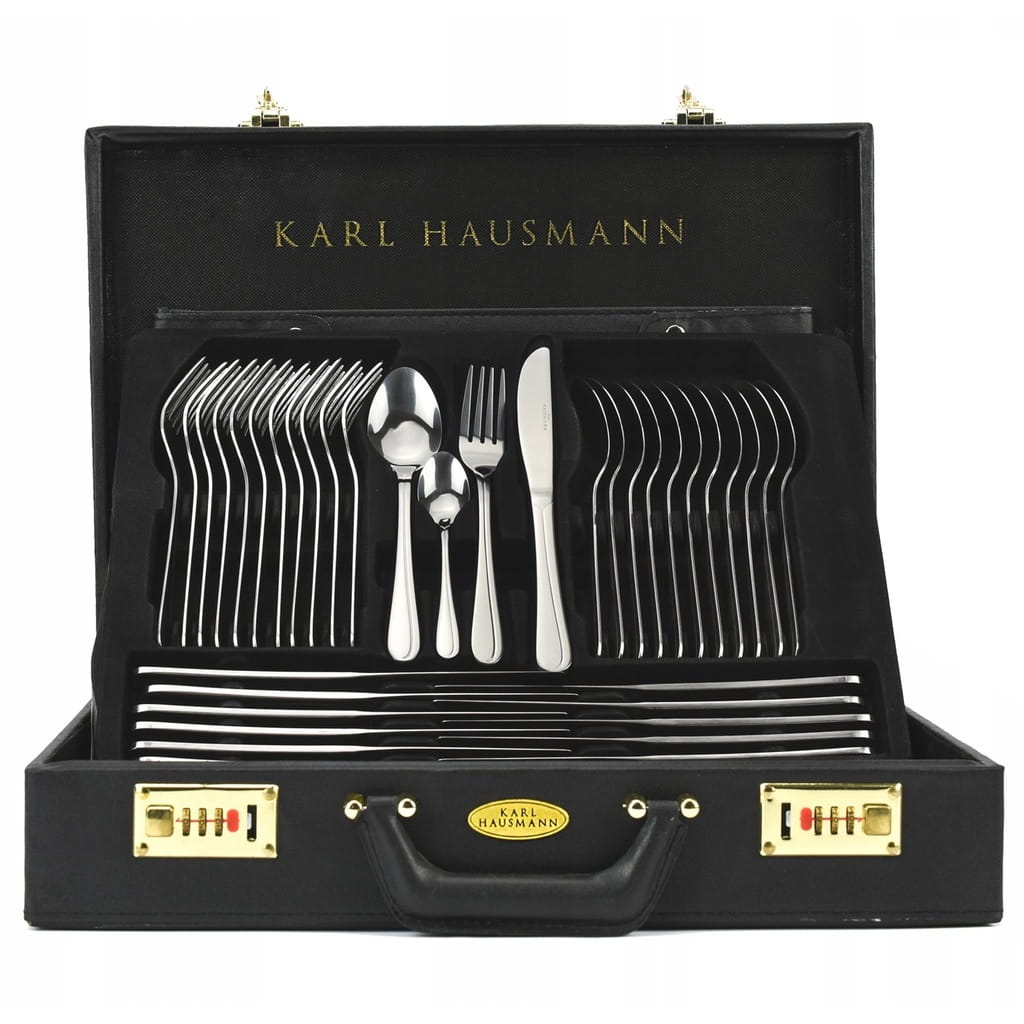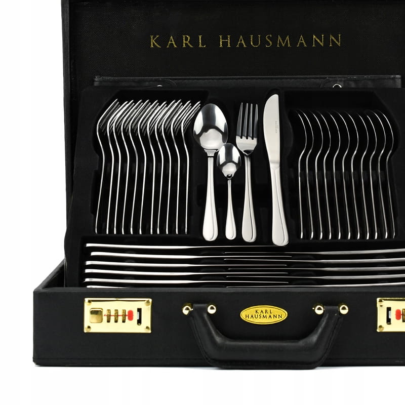 Komplet dedykowany dla 12 osób. Sztućce wykonane są z wysokiej jakości stali nierdzewnej, cechującej się wysoką odpornością na korozję oraz sporą wytrzymałością. Wszystkie elementy zestawu polerowane są na wysoki połysk. Można je myć w zmywarce. Całość zapakowana jest w przydatną, solidną walizkę, ze stopkami izolującymi ją od podłoża.