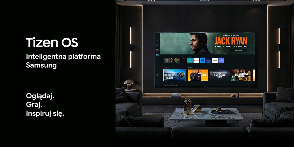 - System Smart TV Tizen OS 8.0 – intuicyjny interfejs, szybka obsługa, dostęp do najpopularniejszych aplikacji