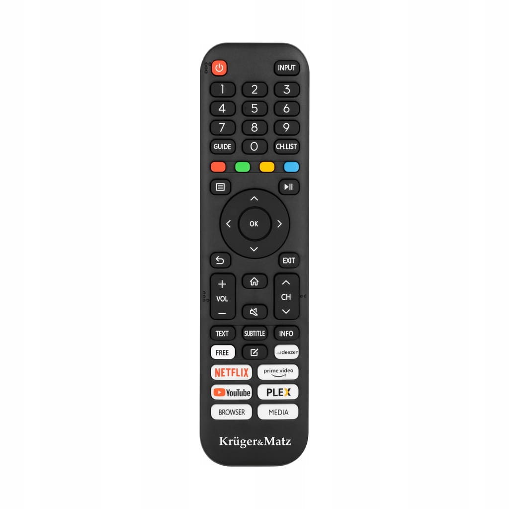Dołączony do telewizora Kruger&Matz pilot został zaprojektowany z myślą o wygodnym i intuicyjnym użytkowaniu. Na pilocie znajdują się skróty do najpopularniejszych aplikacji, takich jak Netflix, YouTube czy Amazon Prime Video. Dzięki nim możesz szybko uruchomić ulubione treści bez konieczności przeglądania menu czy wyszukiwania aplikacji.