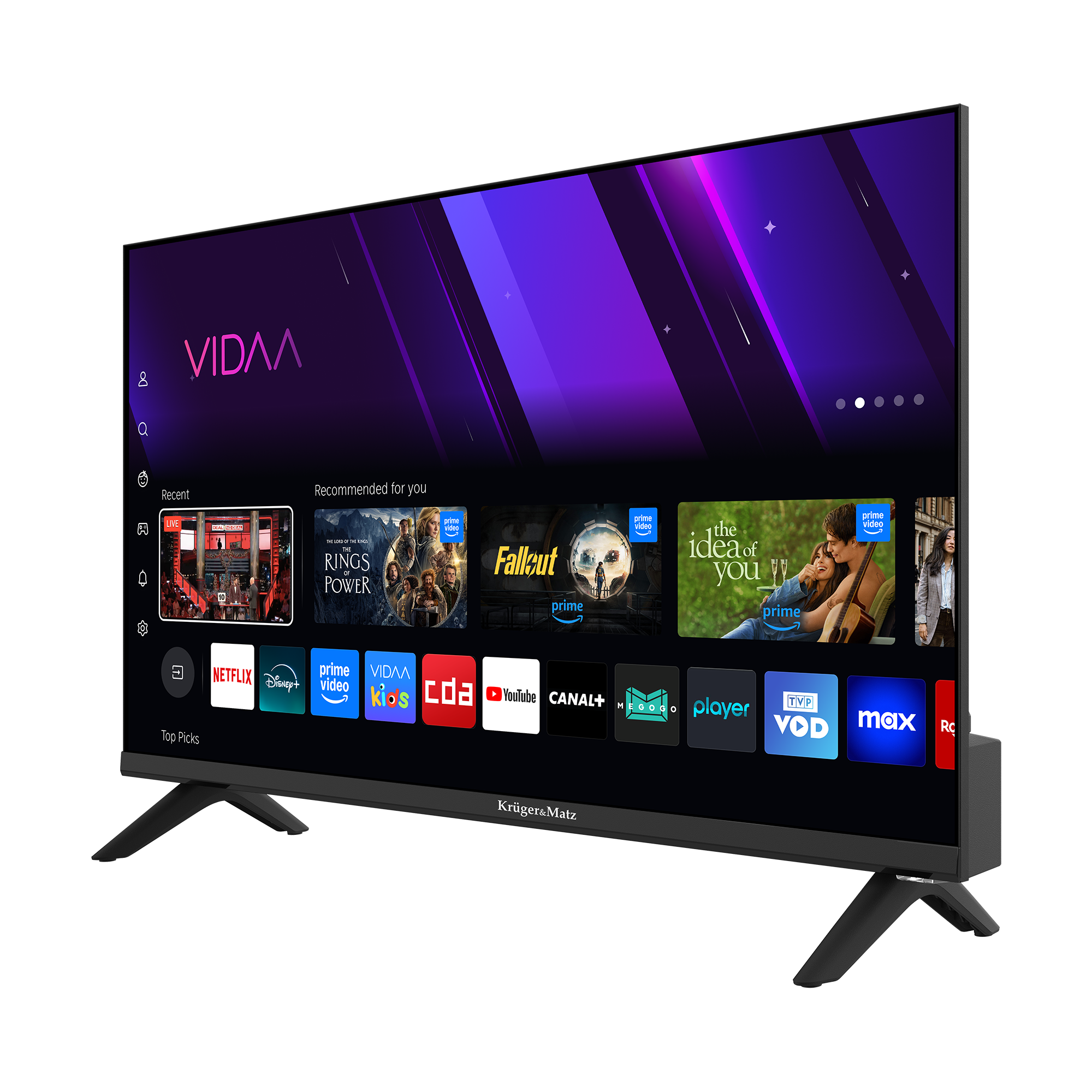 Telewizor Kruger&Matz, dzięki systemowi VIDAA oferuje dostęp do najlepszych treści muzycznych, filmowych i sportowych, w tym popularnych platform takich jak: Netflix, YouTube, Disney Plus czy Amazon Prime Video. Ciesz się ulubionymi filmami i serialami w wysokiej jakości kiedy tylko chcesz.