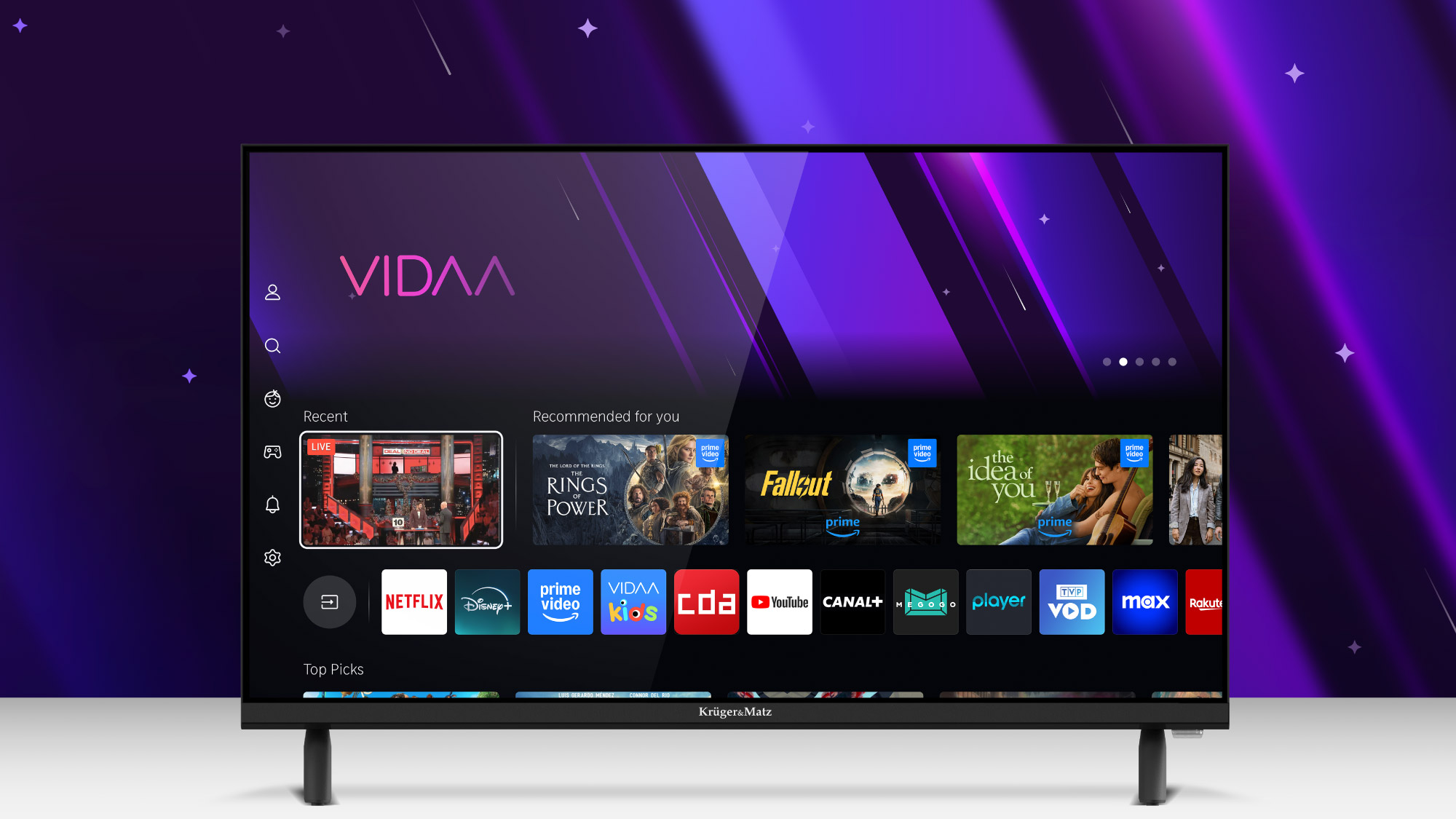 To, co wyróżnia telewizor smart tv Kruger&Matz, to zastosowanie VIDAA, czyli jednego z najszybszych i najbardziej intuicyjnych systemów operacyjnych smart TV. Dzięki temu, zaraz po włączeniu telewizora Kruger&Matz masz dostęp do szerokiej gamy funkcji i rozrywki.