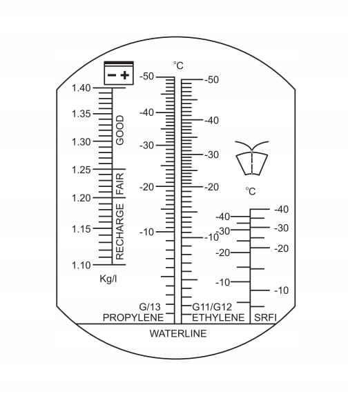 Jeżeli badaniu jest poddawany płyn do spryskiwaczy szyb samochodowych, temperaturę zamarzania można odczytać na skali oznaczonej symbolem spryskiwacza.