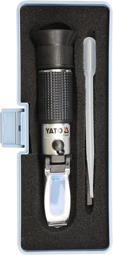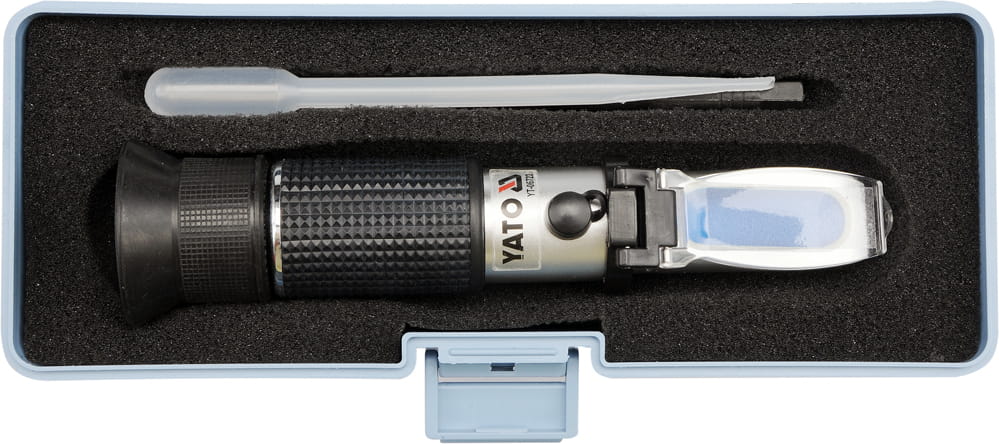 Profesjonalny refraktometr do pomiarów płynów eksploatacyjnych samochodów osobowych, ciężarowych i autobusów. Przeznaczony jest do określania temperatury zamarzania płynu do spryskiwaczy, płynu chłodzącego glikolu proplenowego i glikolu etylowego. Podaje również zakres gęstości elektrolitu. Zestaw zawiera pipetkę do pobierania próbek oraz szmatkę do czyszczenia. Wszystko zapakowane w solidne plastikowe pudełko.