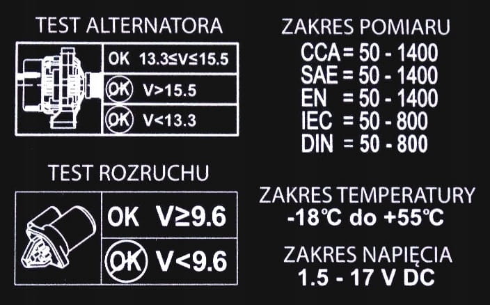 - stanu naładowania akumulatora i zdolności uruchamiania akumulatorów ołowiowych 12V, używanych w pojazdach (TEST AKUMULATORA)