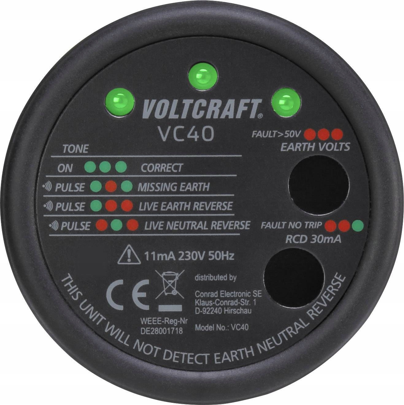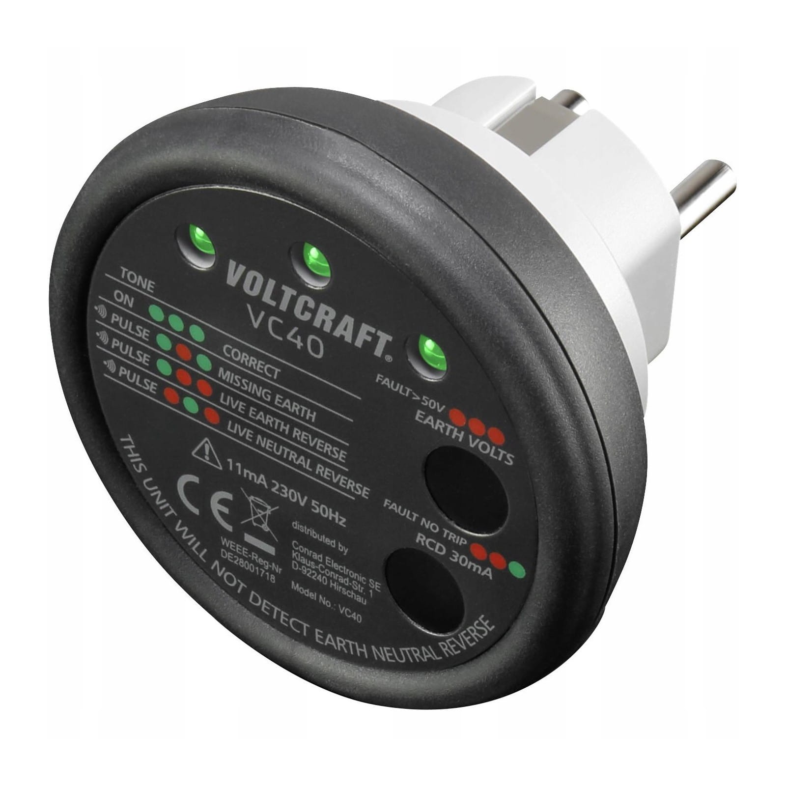 Dodatkowo do wskaźnika statusu LED w przypadku niebezpiecznych błędów rozlega się pulsujący sygnał ostrzegawczy. W braku np. przewodu ochronnego (PE) lub spadku napięcia między PE i N jest zbyt duży, Pulsujący sygnał ostrzegawczy pomaga natychmiast rozpoznać problem.