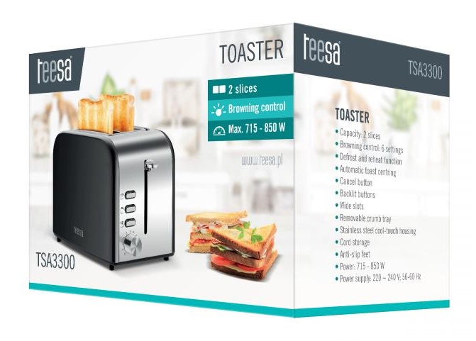 Masz czasem ochotę na urozmaicenie posiłków swojej rodziny? Toster Teesa w szybki i prosty sposób pomoże Ci przygotować pyszne tosty na wasze wspólne śniadania lub kolacje. Jego moc 850 W sprawia, że zaserwowanie dwóch tostów zajmie Ci dosłownie kilka chwil. Dodatkowo 6 opcji regulacji stopnia opiekania oraz funkcja automatycznego wyśrodkowania sprawiają, że tosty będą zawsze równomiernie wypieczone, a Ty idealnie trafisz w gust kulinarny Twoich najbliższych. Tym bardziej, że w tosterze Teesa znajdziesz przycisk, którym w dowolnym momencie możesz przerwać opiekanie, przed upływem wyznaczonego czasu. Toster TSA3300 oferuje Ci także dodatkową funkcjonalność, dzięki czemu za jego pomocą nie tylko rozmrozisz chleb, ale również podgrzejesz przygotowane wcześniej tosty.