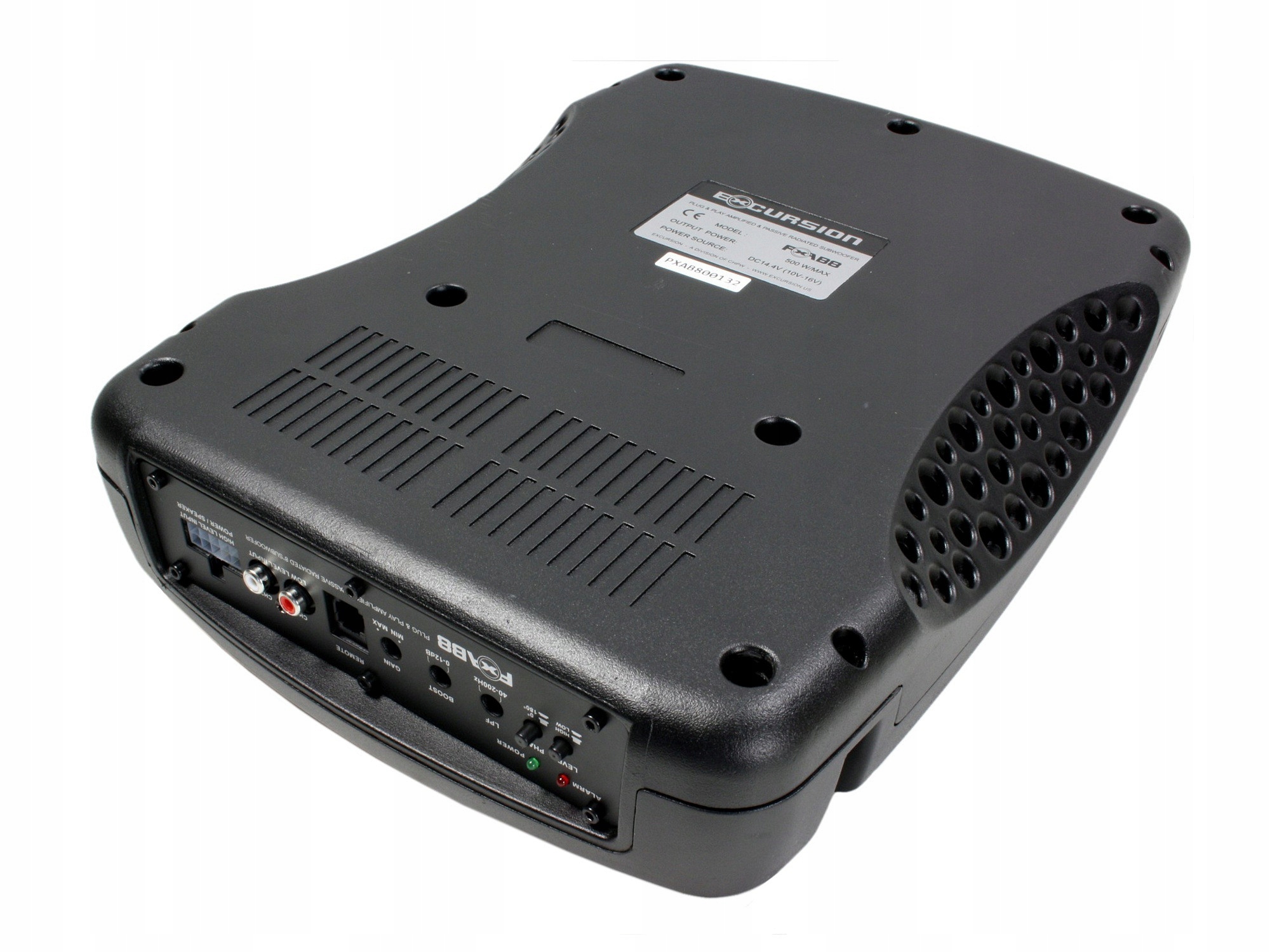 Subwoofer aktywny z serii Excursion Plug OEM umożliwiający rozbudowę fabrycznego systemu audio (OEM) w celu znacznej poprawy jakość brzmienia przy jednoczesnym zachowaniu pełnej funkcjonalności wnętrza samochodu. Subwoofer Excursion PXA-8B posiada bardzo solidną i wytrzymałą aluminiową obudowę odlewaną ciśnieniowo z podwójnym radiatorem, dzięki czemu konstrukcja charakteryzuje się wyjątkowo wysoką wydajnością mocową, nawet przy wyższych poziomach głośności. Wbudowany wzmacniacz mocy został wykonany w technologii SMD na dwustronnej płycie PCB i pracuje w bardzo efektywnej cyfrowej klasie D. Wzmacniacz posiada płynnie regulowany filtr Low Pass (LP), układ zmiany fazy sygnału, regulowany korektor niskich częstotliwości Bass Boost 0-12dB/45Hz oraz stopień wejściowy z możliwością wyboru poziomu sygnału Low/High (sygnał przesyłany z odtwarzacza kablami RCA lub pobierany bezpośrednio z głośników fabrycznych). Subwoofer Excursion PXA-8B posiada także układ "Auto Turn ON/OFF", umożliwiający automatyczne załączanie i wyłączanie wewnętrznego wzmacniacza w przypadku korzystania z wejść sygnałowych o poziomie głośnikowym (High Level). W komplecie znajduje się również zdalny przewodowy regulator umożliwiający sterowanie głośnością basu z fotela kierowcy.