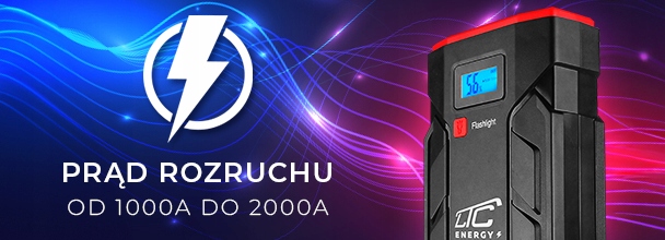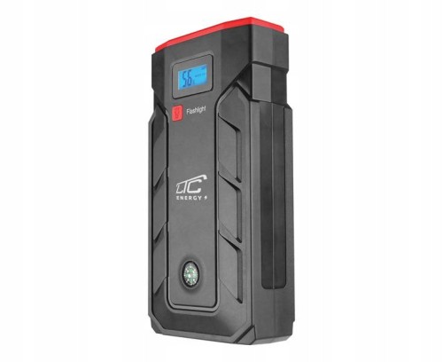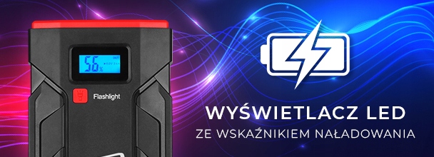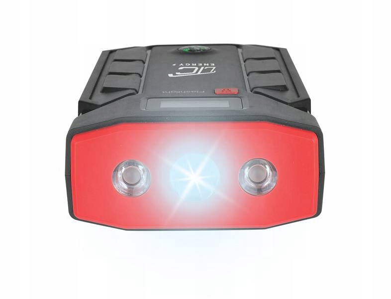 Jump starter 12V ma pojemność aż 20000 mAh, posiada wbudowaną użyteczną latarkę z trzema trybami oraz wyświetlacz ze wskaźnikiem naładowania.