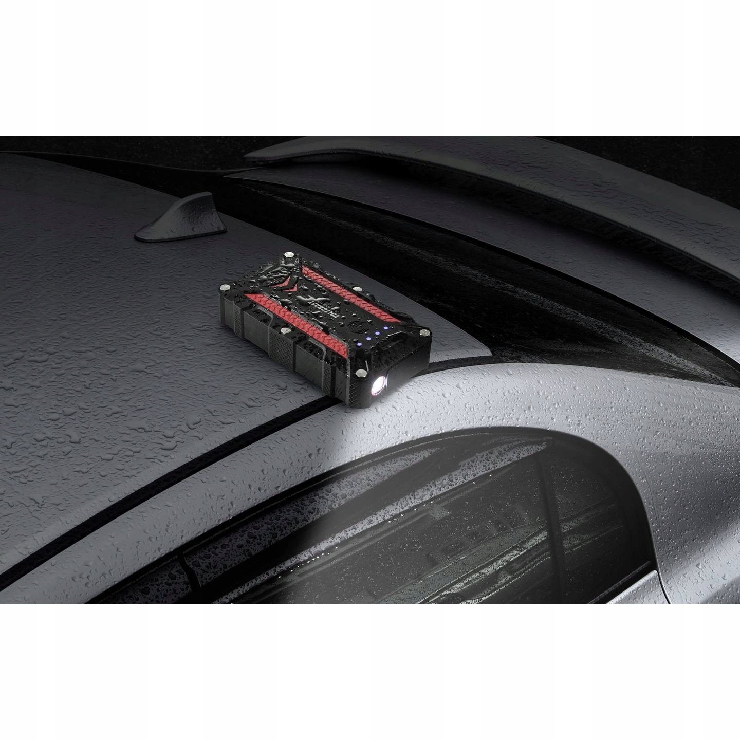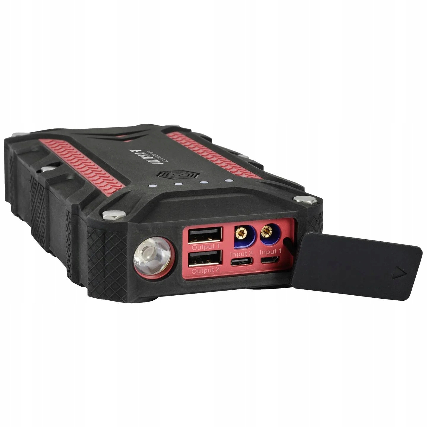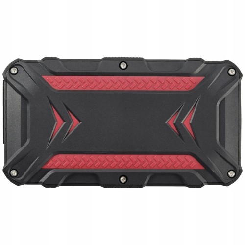 Jump starter 12V ma pojemność aż 10000 mAh, posiada wbudowaną użyteczną latarkę oraz wskaźnik naładowania.