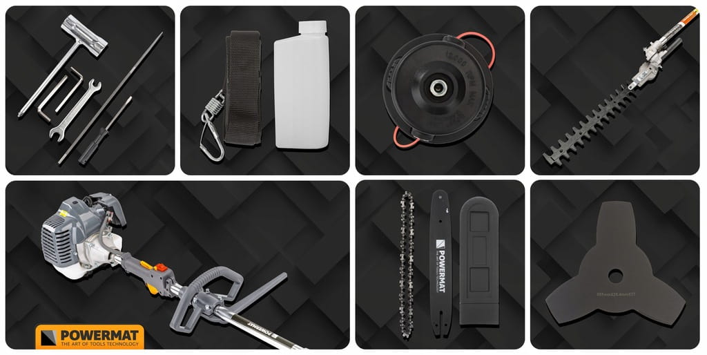 Wielofunkcyjna kosa spalinowa Powermat łączy funkcje kosy, podkaszarki, piły i nożyc do żywopłotu, zapewniając wszechstronność w ogrodzie. Mocny silnik 42cm³, ergonomiczny uchwyt, system antywibracyjny i pas naramienny gwarantują wygodę i bezpieczeństwo. Dzięki wymiennym akcesoriom sprawdzi się przy koszeniu trawy, zarośli i cięciu gałęzi – idealna dla amatorów i profesjonalistów!