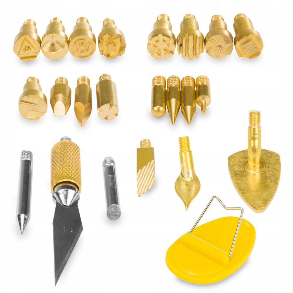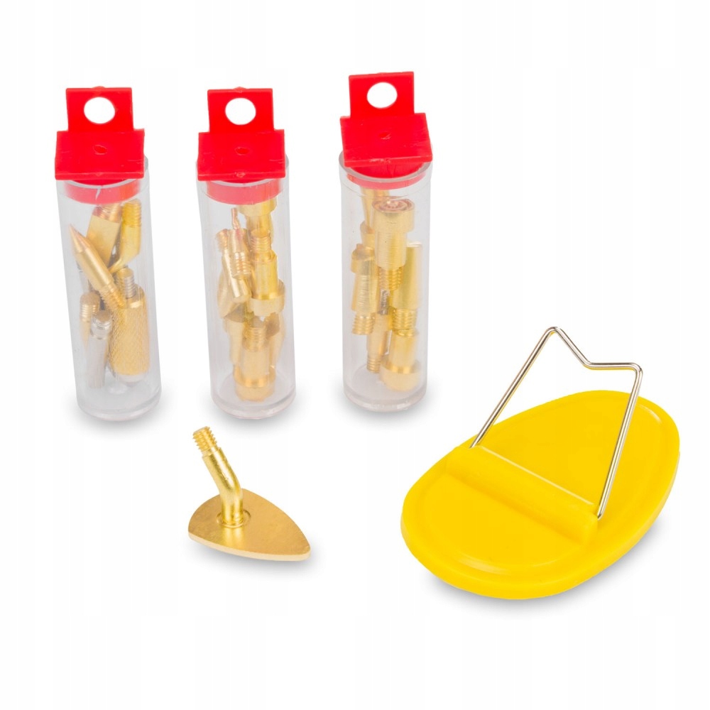W zestawie załączone są 22 końcówki, dzięki którym wypalimy różnego rodzaju wzory na drewnie, korku czy skórze. Załączony nożyk po rozgrzaniu ułatwi cięcie wielu materiałów. Dzięki zastosowaniu, mosiądzu do wykonania końcówek, bardzo szybko się nagrzewają do temperatury roboczej. W zestawie załączona jest również podstawka pod kolbę lutownicy/opalarki, dzięki niej odłożymy urządzenie bez obaw. Końcówki montowane są za pomocą gwintu na mosiężnej końcówce kolby.