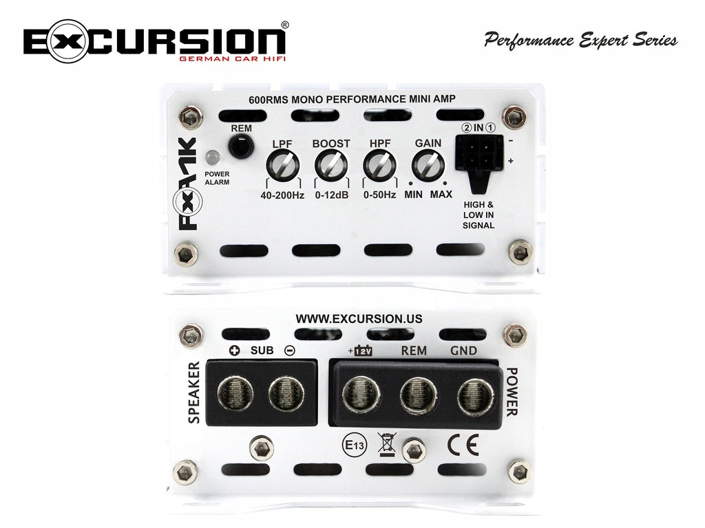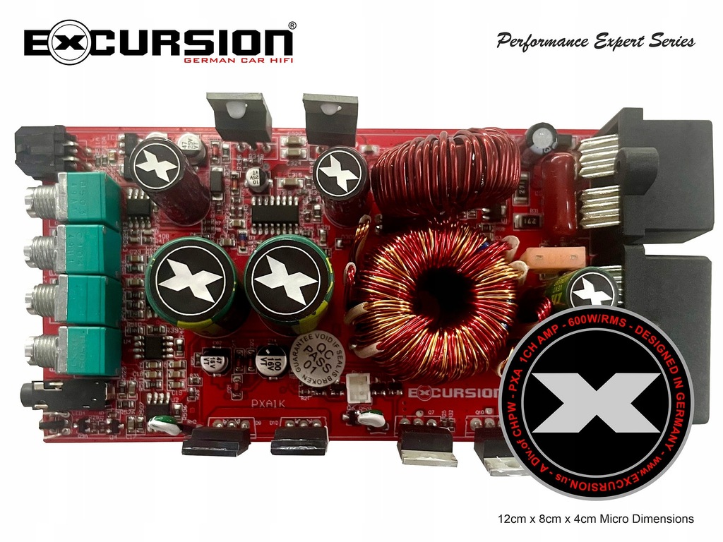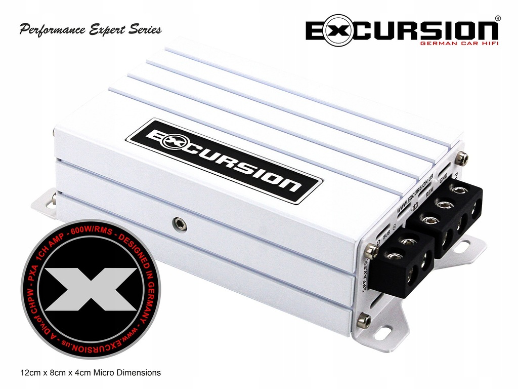 Miniaturowy 1-kanałowy wzmacniacz samochodowy z serii PXA (Performance Expert) niemieckiej marki Excursion