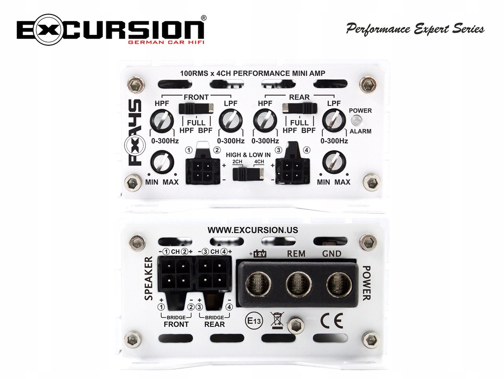 WZMACNIACZ samochodowy Excursion do systemów fabrycznych 4 kanały 4x 100W lub 2x 200W od 1 ohm do SUBWOOFERA