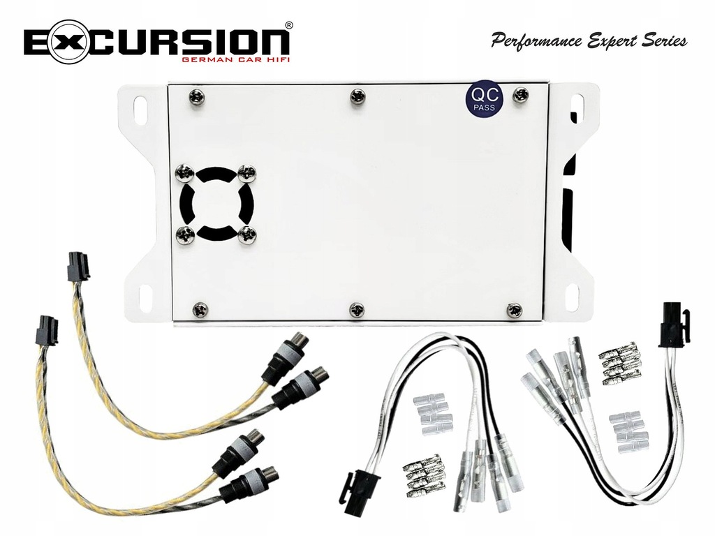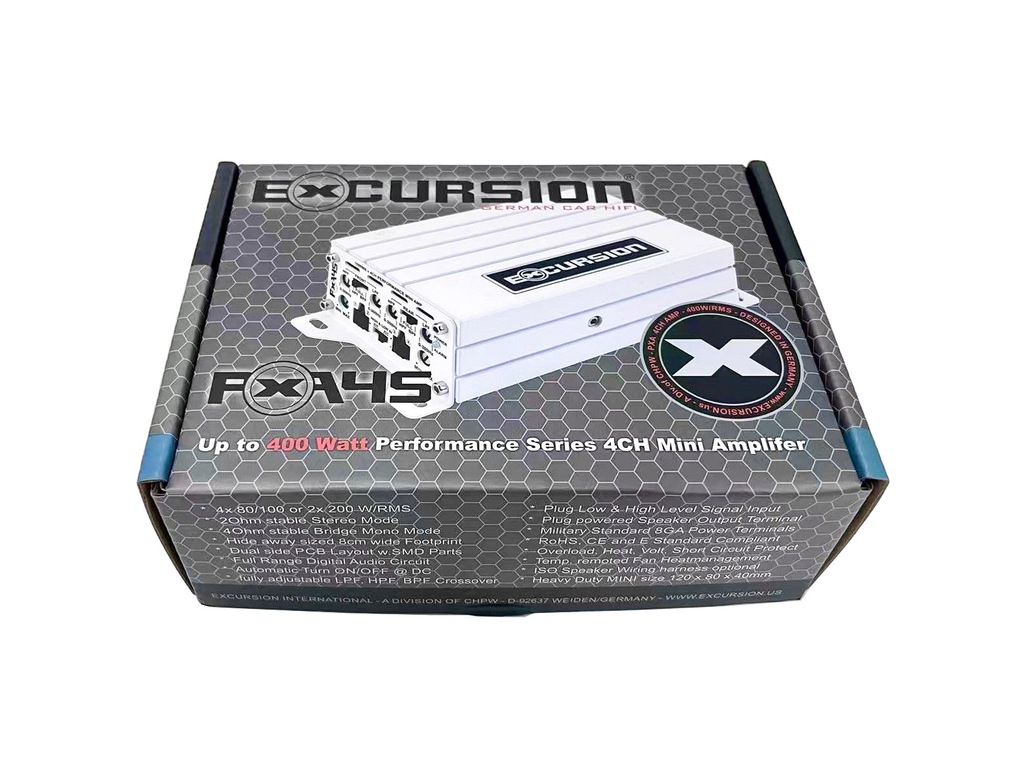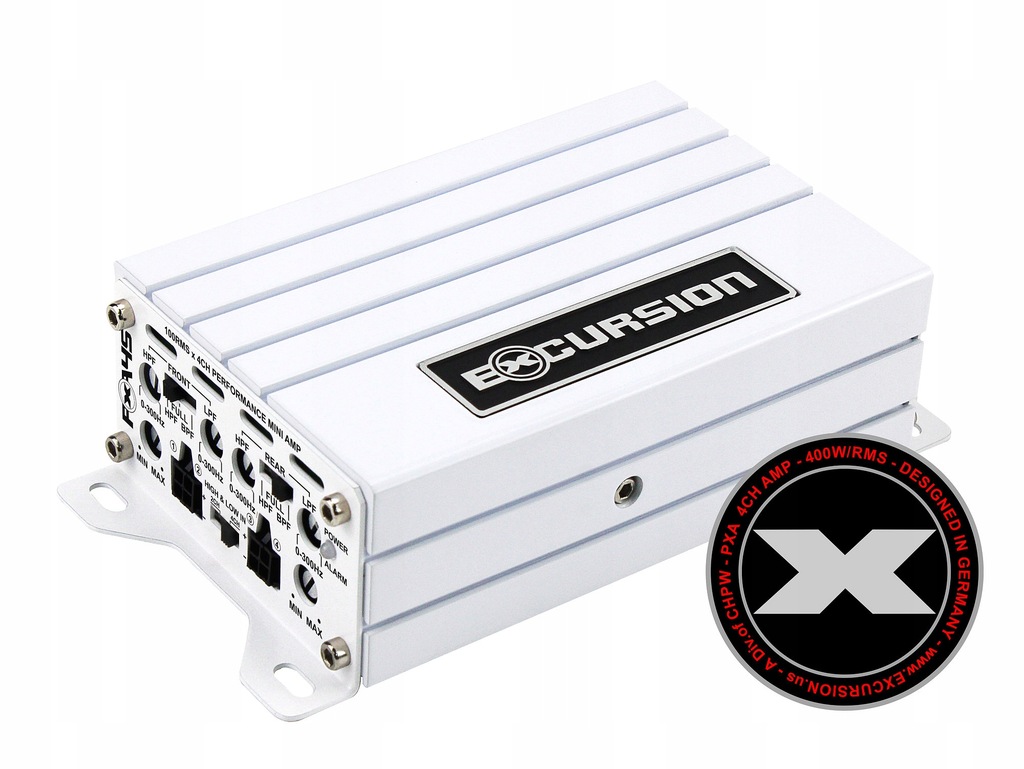 Miniaturowy 4-kanałowy wzmacniacz samochodowy z serii PXA (Performance Expert) niemieckiej marki Excursion