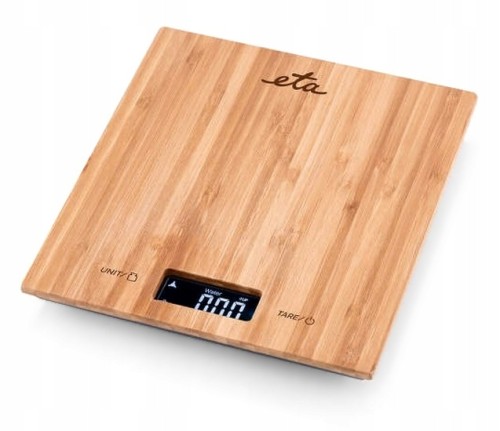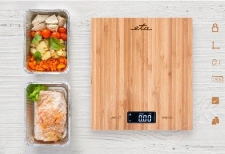 Lubisz przyrządzać potrawy z odległych zakątków świata według oryginalnych przepisów? Waga spożywcza Eta posiada wybór jednej z czterech jednostek pomiaru - dlatego nie musisz już samodzielnie nic przeliczać. Do atutów można z pewnością zaliczyć czytelny wyświetlacz LCD oraz rozmiar urządzenia – ta waga ma naprawdę niewielkie wymiary, dlatego bez problemu znajdzie się dla niej miejsce, nawet w małej kuchni. Dodatkowym atutem są dotykowe sensory ( przyciski ) funkcyjne umieszczone po bokach wyświetlacza LCD. Platforma z drewna bambusowego jest neutralna dla produktów spożywczych, nie wchłania i nie wydziela zapachów.