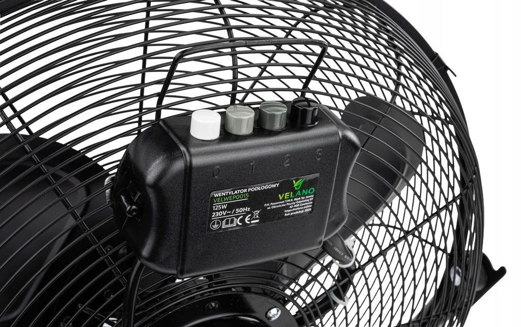 Wentylator wyposażony jest w mocny silnik o mocy 125 W, co pozwala na generowanie silnego strumienia powietrza i skuteczne jego mieszanie w pomieszczeniu.