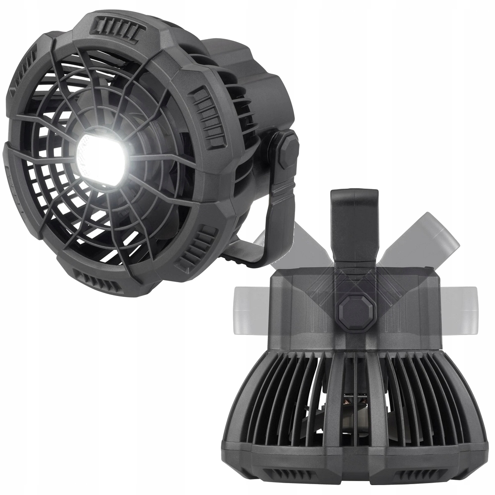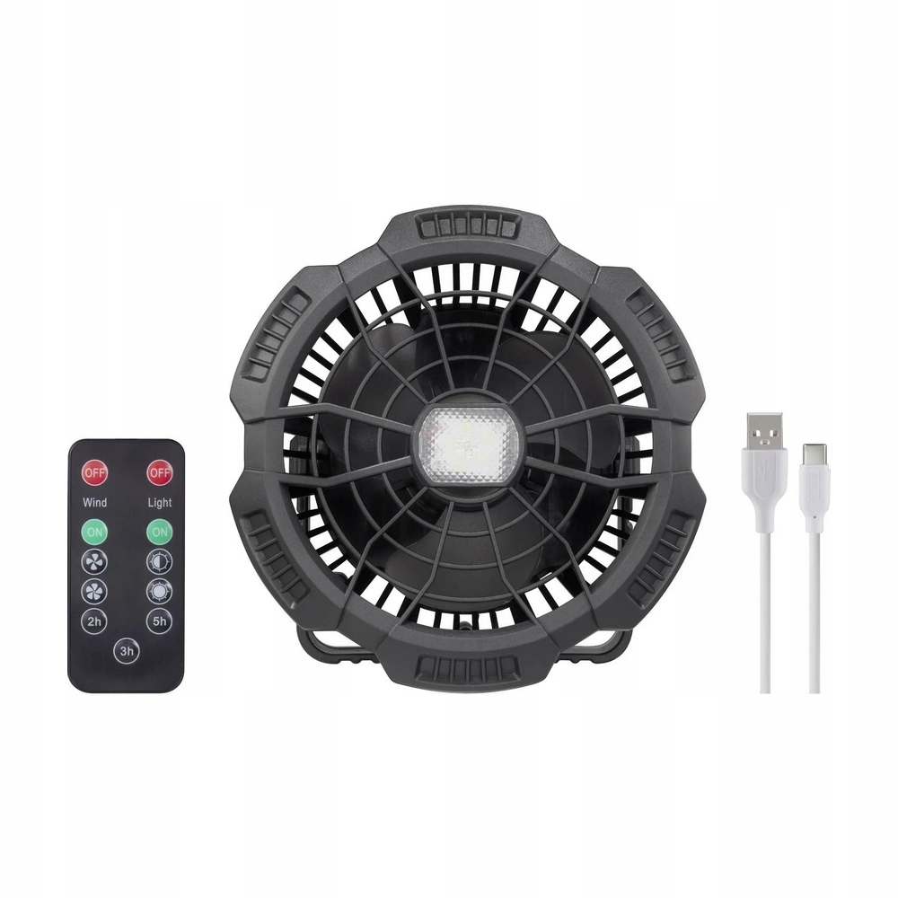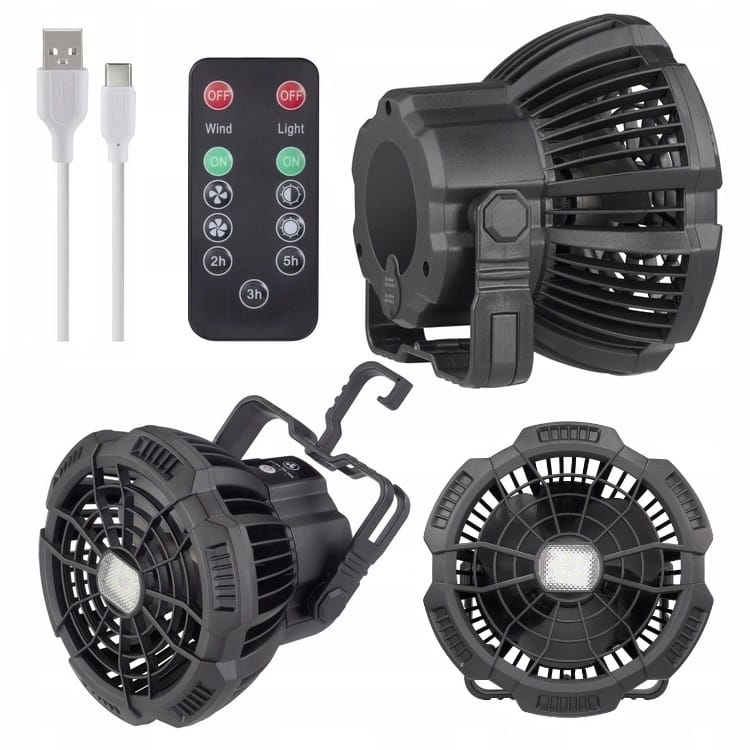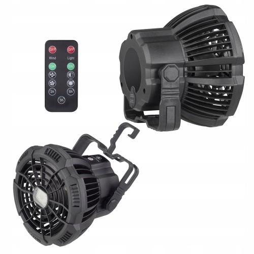 Zakotwiczony na haczyku na maszcie namiotowym lub stole warsztatowym bezprzewodowy wentylator zewnętrzny 3 w 1 można ustawić za pomocą pilota.