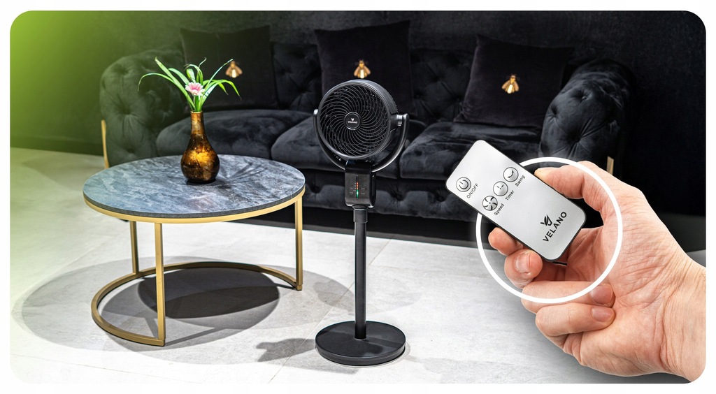 Sterowanie odbywa się dotykowo lub pilotem. Dzięki oscylacji, regulacji nachylenia głowicy i bezpiecznej konstrukcji z trwałych materiałów wentylator zapewnia wygodę, funkcjonalność i bezpieczeństwo użytkowania w każdym domu.