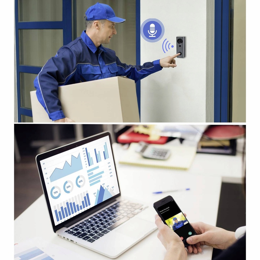 Dwukierunkowa transmisja audio umożliwia rozmowę z gośćmi bez względu na to, czy jesteś w domu, czy w podróży. Odbieraj paczki, wydawaj polecenia lub witaj znajomych — łatwo i za pośrednictwem aplikacji.