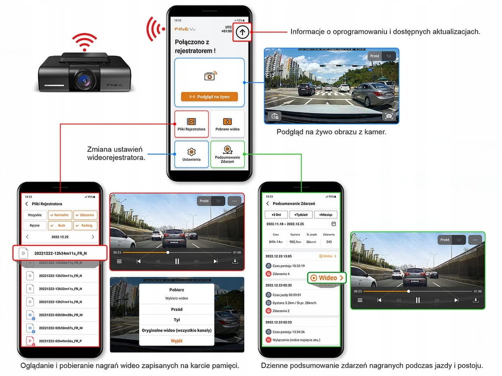 - Aplikacja FineVu Wi-Fi: ustawienia rejestratora, podgląd obrazu na żywo, przeglądanie i pobieranie nagrań, ilość i szczegóły zdarzeń, czas jazdy i parkowania, przejechany dystans, średni prędkość jazdy, podgląd trasy na mapie, aktualizacja oprogramowania, bardzo prosta obsługa.