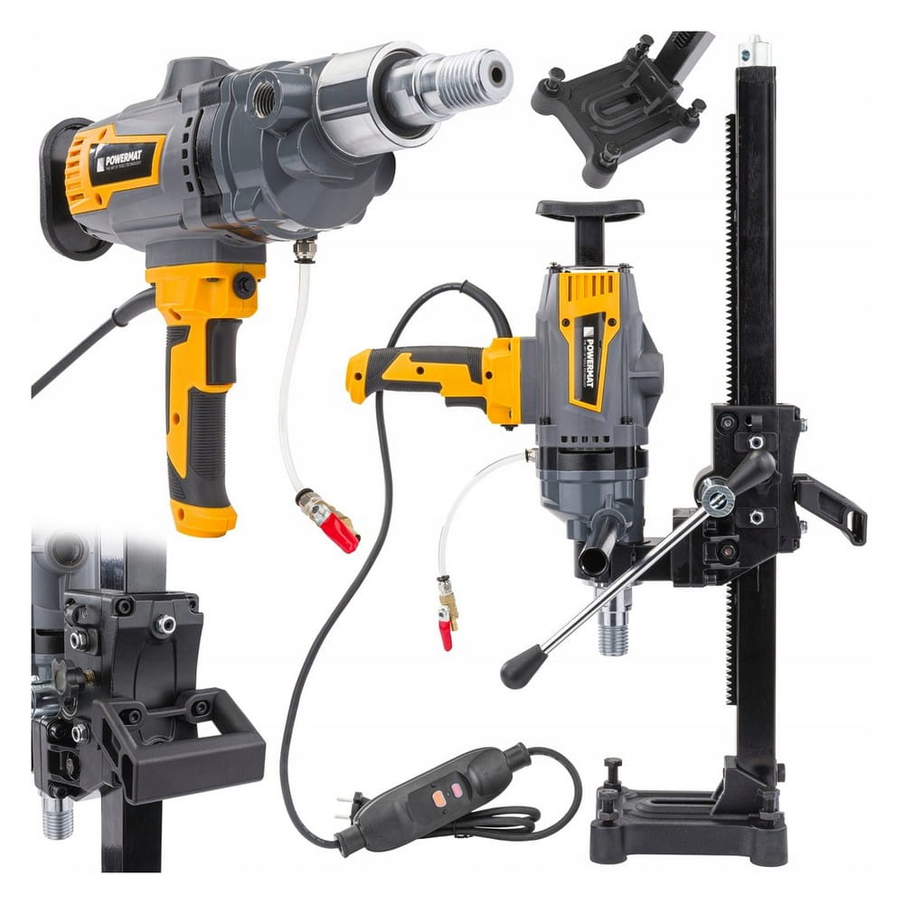 Wiertnica do betonu marki Powermat o mocy 2600 W to narzędzie przeznaczone do wiercenia m.in. na mokro, co zwiększa bezpieczeństwo użytkowania i wydajność w porównaniu do konkurencyjnych modeli. Urządzenie osiąga prędkość 1500 obrotów na minutę, a wiertło mocowane jest na uchwyt o średnicy 1 ¼ cala. Umożliwia wykonanie otworów o maksymalnej średnicy 195 mm. Wiertnica Powermat to trwałe urządzenie, które zapewnia szybkie efekty w trudnych warunkach. W zestawie znajdują się praktyczne akcesoria, takie jak statyw, wspornik barkowy i śruby montażowe.