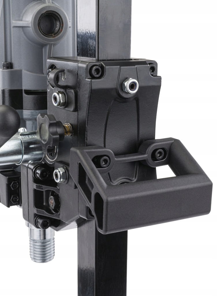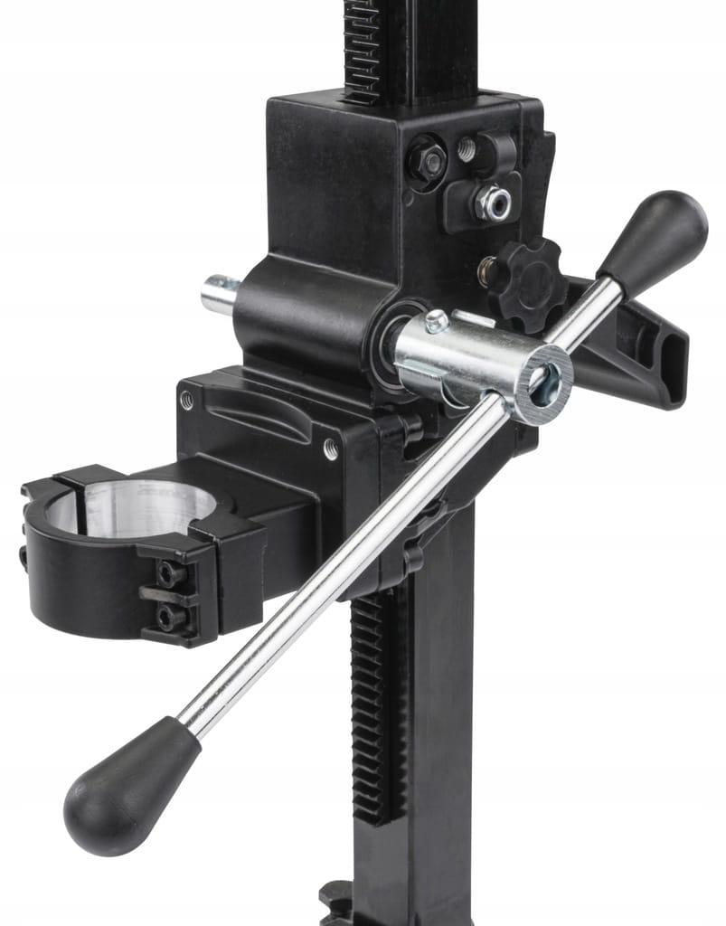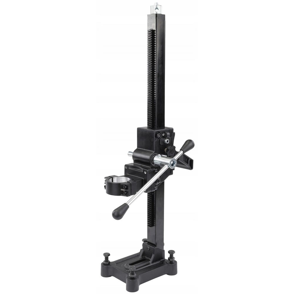 W komplecie z urządzeniem znajduje się statyw z przekładnią, który umożliwia wiercenie w twardych materiałach, takich jak granit czy beton, bez potrzeby użycia siły.