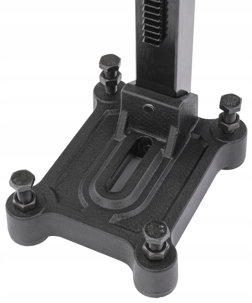 W zestawie znajduje się wspornik barkowy oraz podstawa stojaka, która wyposażona jest w cztery śruby poziomujące i stabilizujące. Dzięki stabilnemu przymocowaniu statywu, uzyskujemy gwarancję precyzji wykonywanego odwiertu.