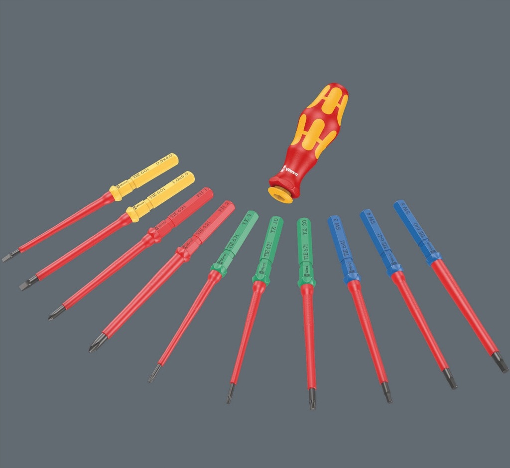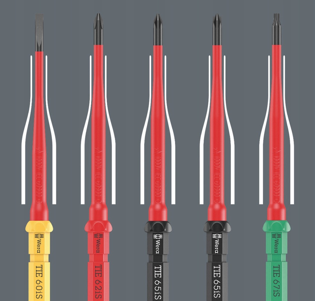 - Trzpienie wymienne VDE (długość 157 mm) z praktyczną funkcją pokręcania, zabezpieczeniem przed staczaniem się narzędzia z miejsca pracy i systemem wyszukiwania narzędzi Take it easy: z oznaczeniem kolorystycznym według profilu i laserowym oznaczeniem rozmiaru