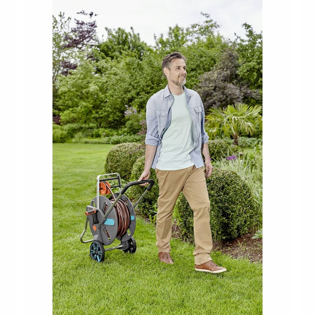 Wózek na wąż GARDENA umożliwia przechowywanie węża ogrodowego zajmujące mało miejsca. Wąż można niezawodnie nawinąć na duży bęben dzięki ergonomicznej korbie z miękkimi elementami z tworzywa sztucznego i stabilnej prowadnicy węża.