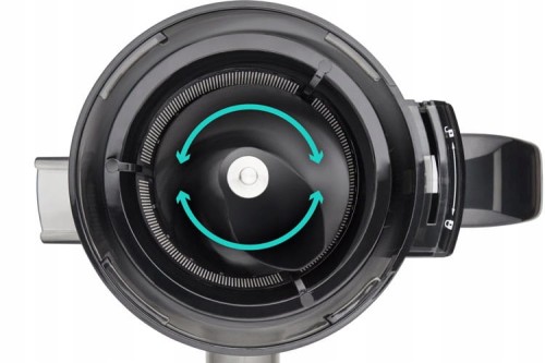 System jednoślimakowy, moc 2000 W oraz prędkość w zakresie 40-65 obrotów/minutę zapewniają wysoką wydajności, która sprawi, że zawsze wyciśniesz maksymalną ilość soku. Zaletą jest bieg wsteczny, który pomoże Ci odblokować urządzenie, gdy podczas pracy zostanie ono zablokowane np. przez pestkę owocu.
