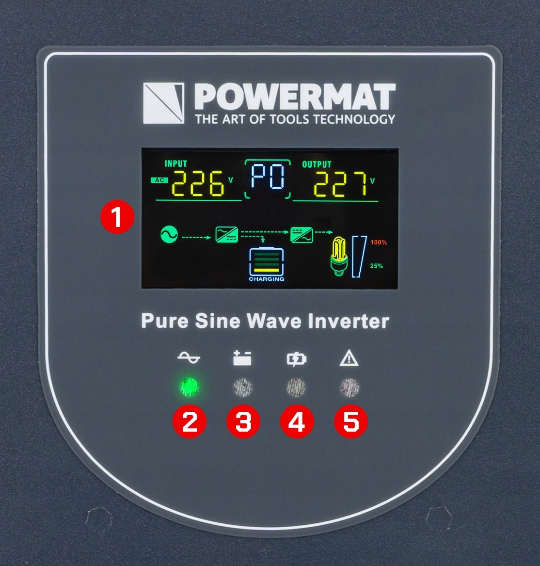 - Tryb przetwornicy DC/AC: wymuszenie zasilania bezpośrednio z akumulatora bez podłączenia do sieci energetycznej.