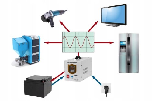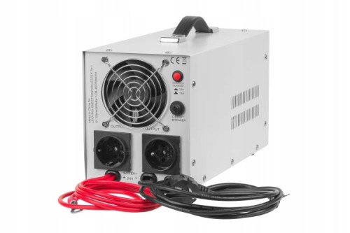 - Jako przetwornica - przetwarza napięcie stałe 12V DC z akumulatora na napięcie zmienne 230V AC