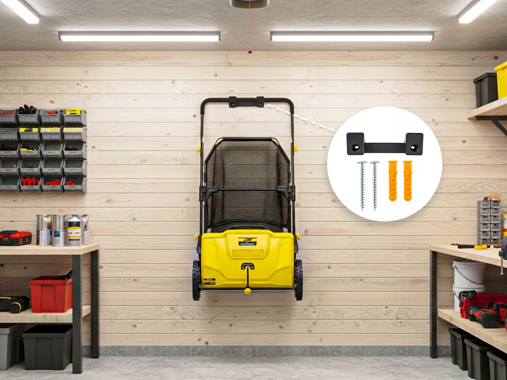 Po pracy wystarczy zawiesić zamiatarkę na ścianie – bez zajmowania miejsca w garażu czy altanie. Gotowa, gdy jej potrzebujesz, niewidoczna, gdy nie.