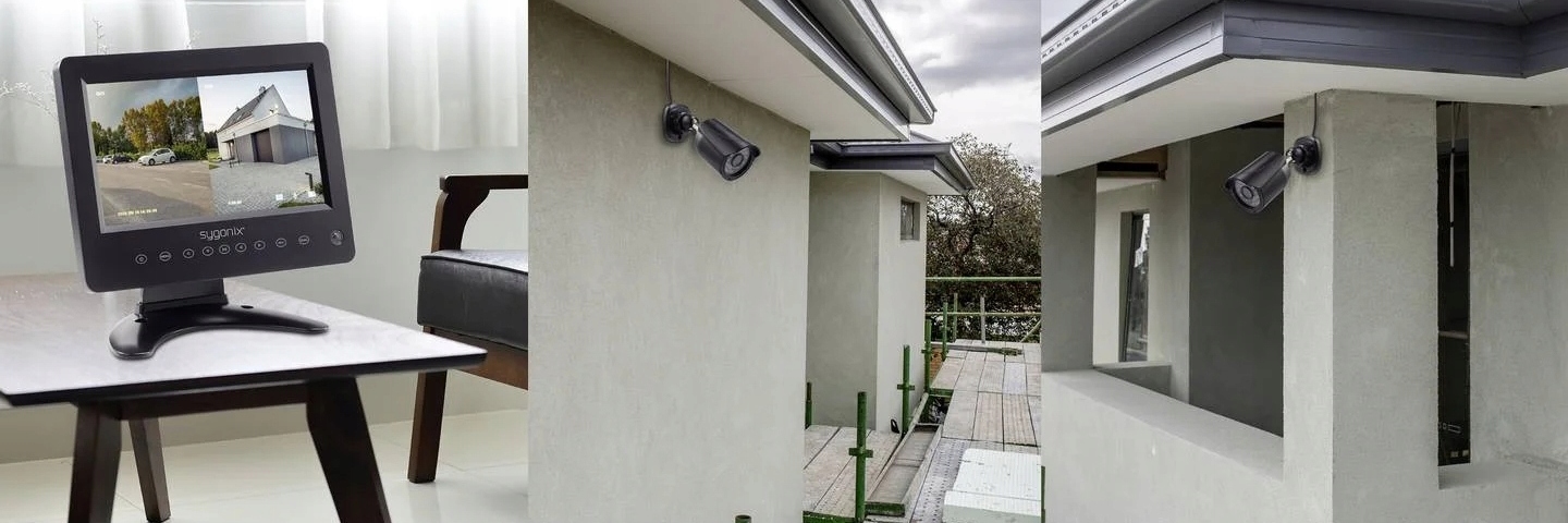 Zestaw kamer monitorujących Sygonix wyposażony jest w dwie przewodowe kamery IR-LED, za pomocą których można obserwować otoczenie z dwóch perspektyw pod kątem 70 ° (poziomej i pionowej).