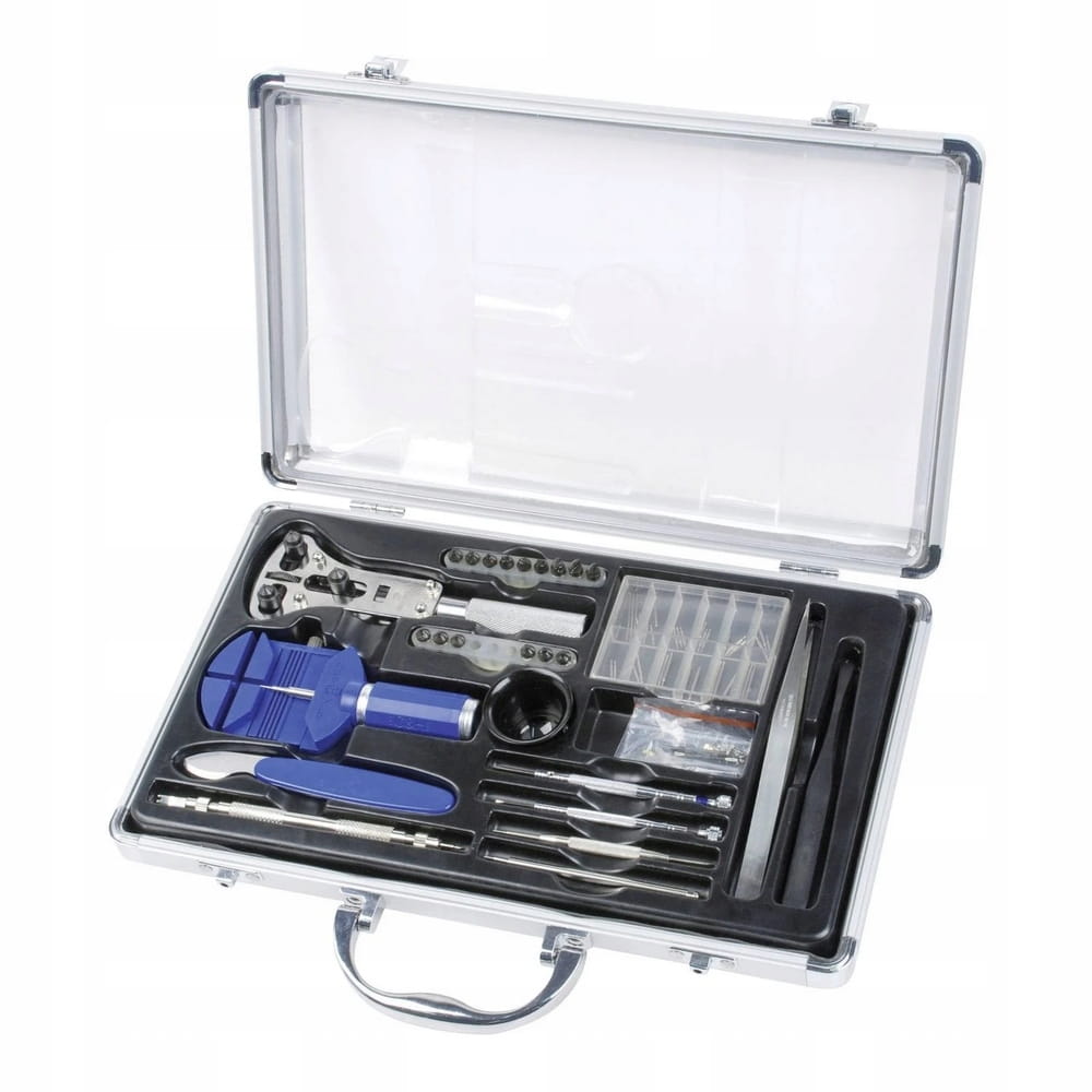 Otwieracz do obudowy zegarków jest regulowany w 6 różnych pozycjach. W zestawie znajduje się przyrząd do usuwania końcówek wkrętaka, dzięki któremu można skracać i wydłużać paski zegarka, a także piny do pasków, do zegarków w różnych rozmiarach.