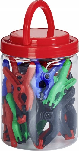 - 18 x zacisk szczękowy 63 mm długości, maks. rozpiętość szczęk 30 mm (czarny, zielony, czerwony, niebieski)